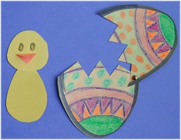 Placez le poussin au centre du dessus de la carte. Placez l'oeuf par-dessus le corps du poussin en laissant la tête dépasser la partie inférieure de l'oeuf. Après avoir déterminer leur emplacement sur la carte, appliquer de la colle sous le poussin et sous la partie inférieur de l'oeuf. On doit aussi collez la partie supérieure en position ouverte si on ne dispose pas d'attache parisienne.